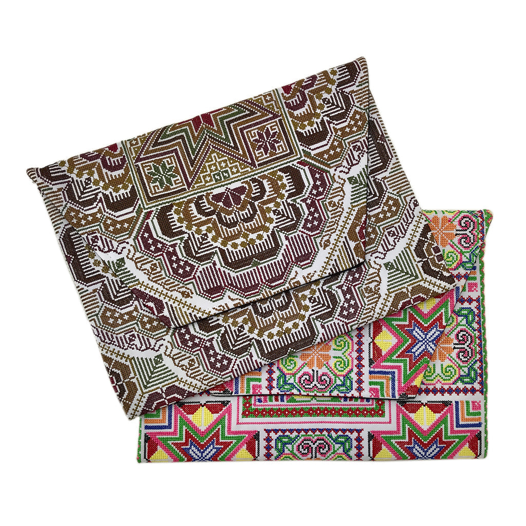 With precise attention to detailed stitching, this clutch adds a pop of color to any outfit. Perfect for the beach, brunch, and everything in between! It is completely embroidered on the front and back by the Hmong Hill Tribes of Northern Thailand. This needlepoint bag is a fusion of traditional Thai design with a modern twist.